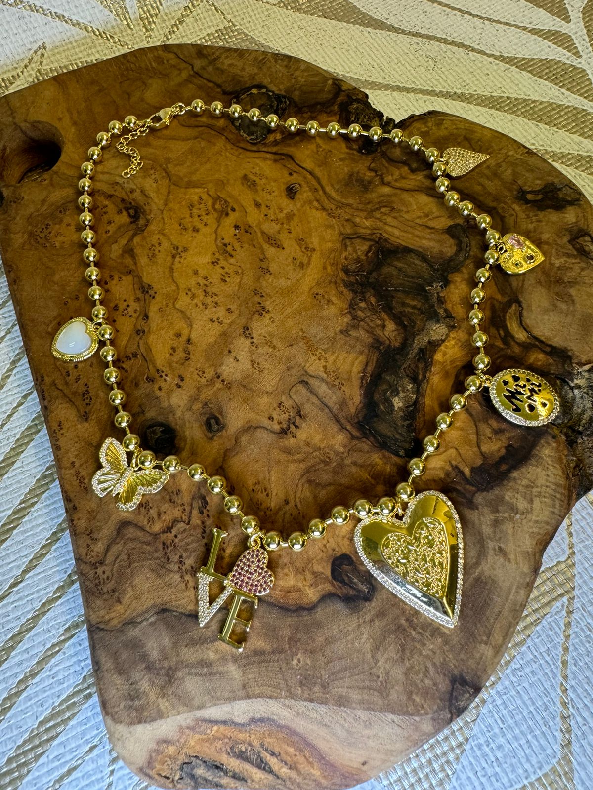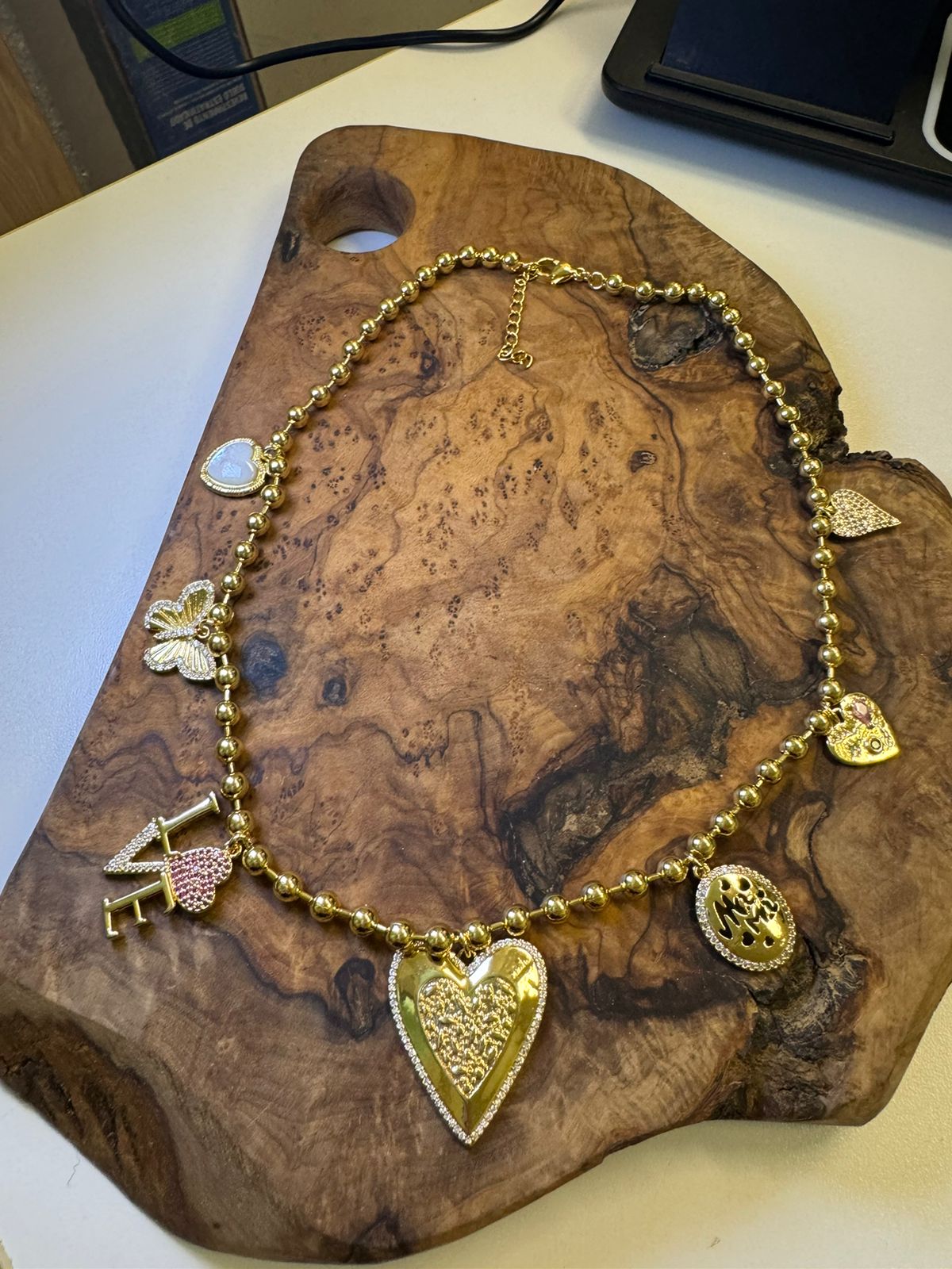 This 18k gold plated multi charm hearts necklace is a stunning addition to any jewelry collection. The intricate design features multiple heart charms, adding a touch of elegance and romance to any outfit. With its durable gold plating, this necklace is a timeless piece that will last for years to come.