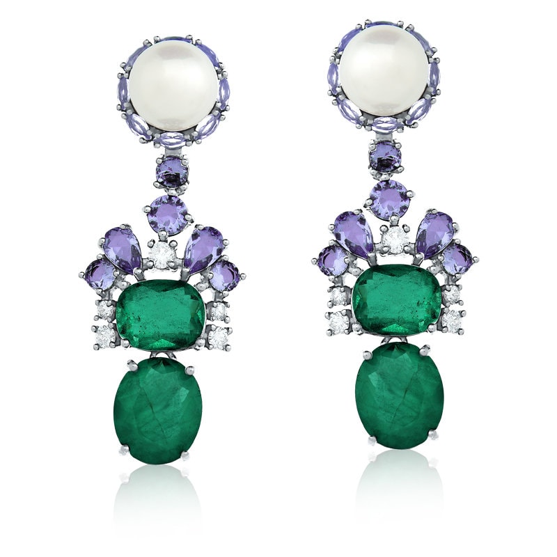 1. Green emerald color crystals with lavender amethyst crystals and central pearl.