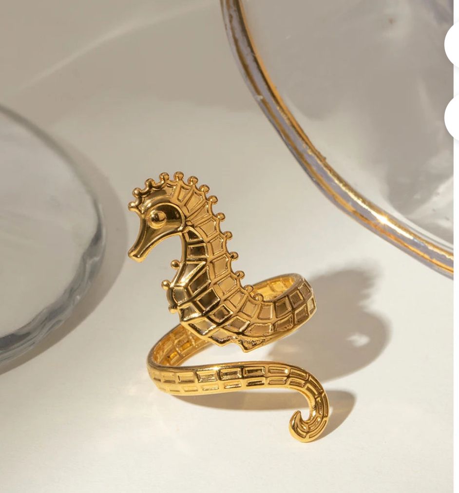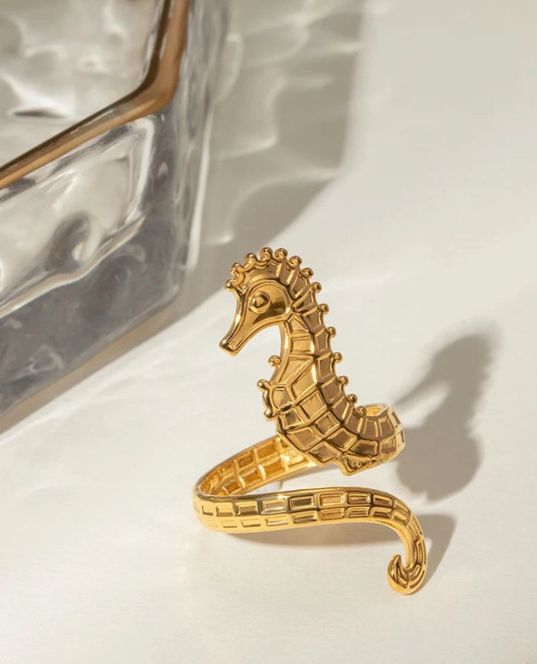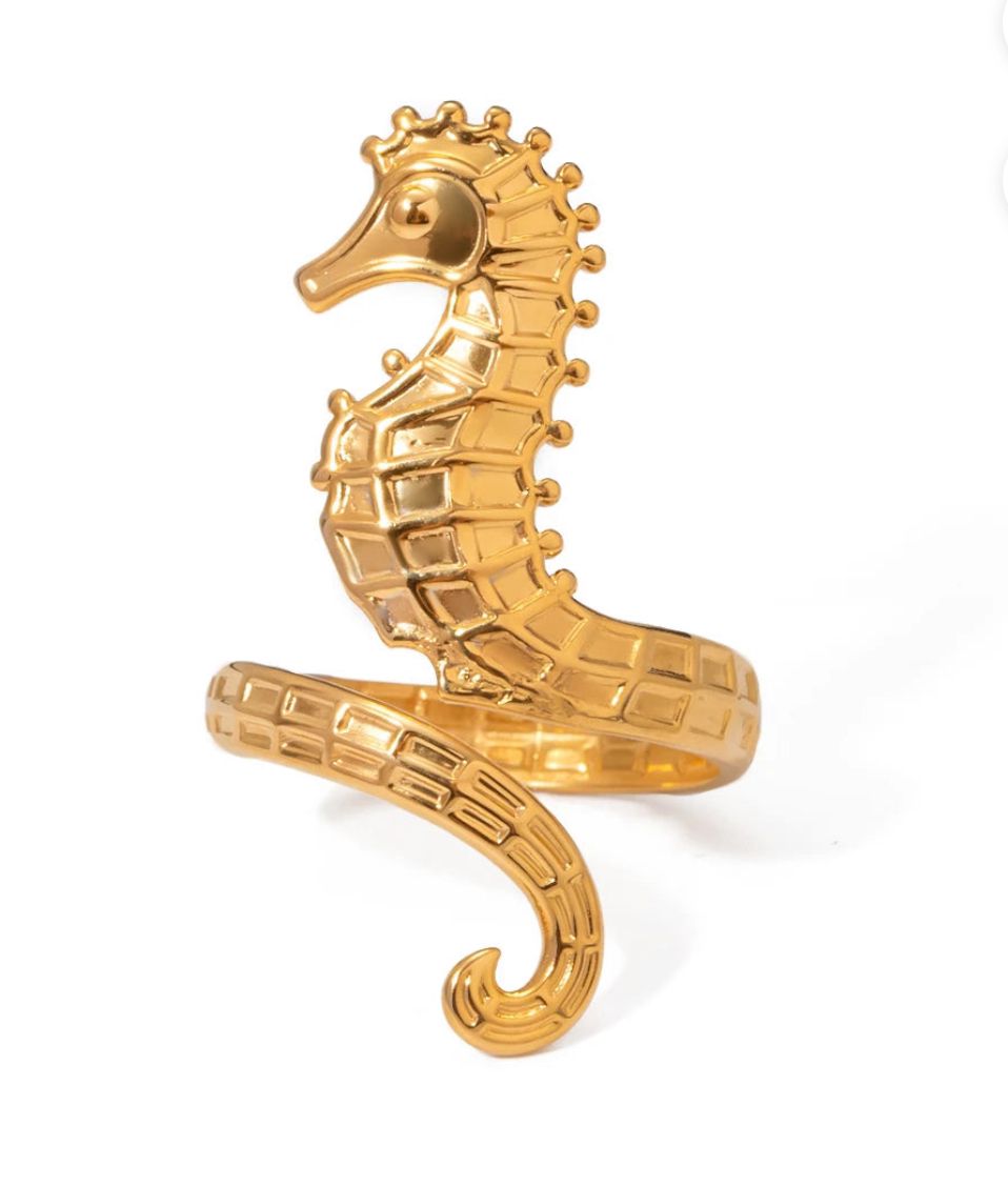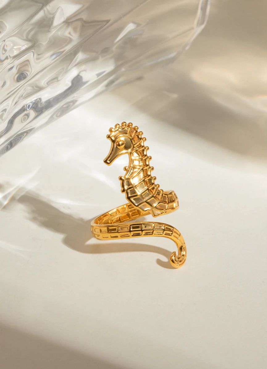Elevate your style with the Sea Horse Open Ring, made of ethically sourced 18K gold plated over stainless steel. Hypoallergenic and water-resistant, this adjustable ring is perfect for everyday wear. Feel confident and fashionable while promoting ethical and safe fashion choices.